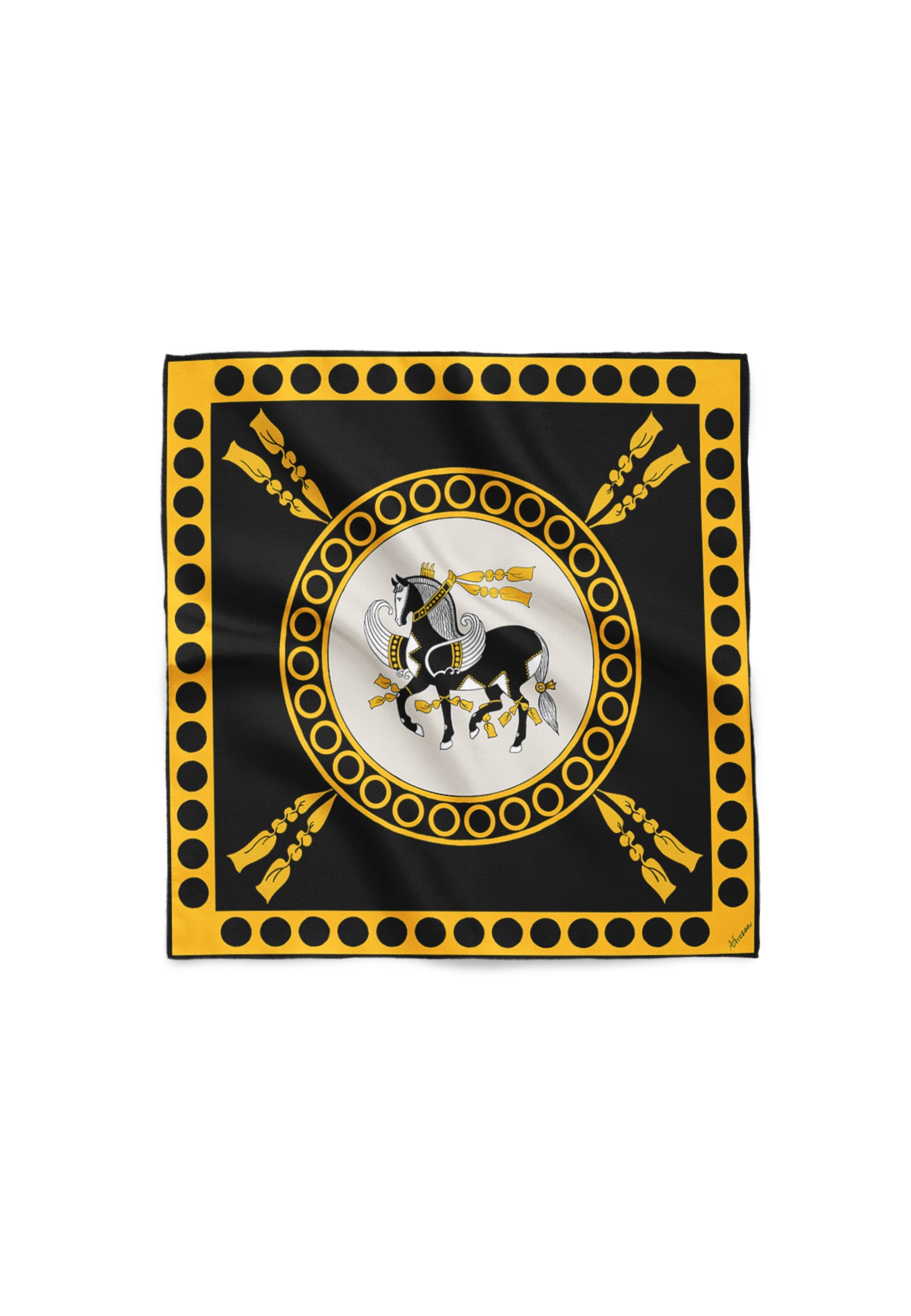 Elevate your style with the Pari-dar Black Gold silk scarf, crafted from 100%  silk in a 90x90cm square. Inspired by the winged horse—a historic emblem of royal power and grandeur—this scarf embodies freedom, eternity, and a profound connection to cultural heritage. Its luxurious texture and rich colors offer a sophisticated accessory that carries a timeless legacy, seamlessly blending tradition with contemporary elegance. Perfect for those who appreciate refined craftsmanship and meaningful design.